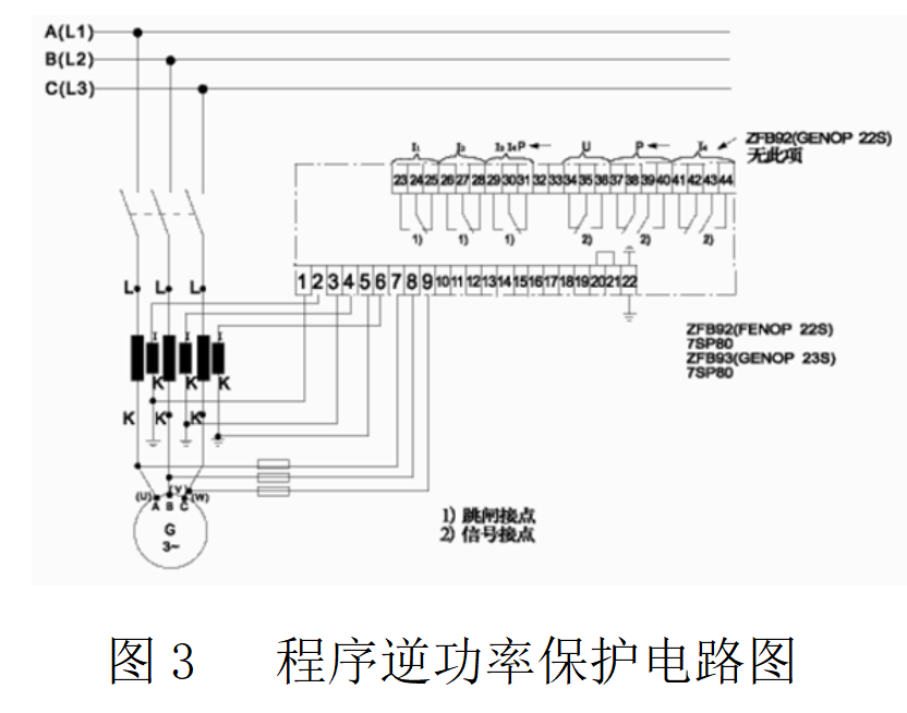 (1)逆功率繼電器:采用方向元件(如90°接線)結(jié)合有功計(jì)算模塊,輸出跳閘信號(hào)。